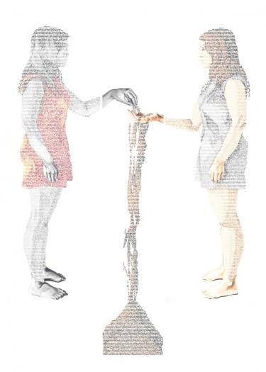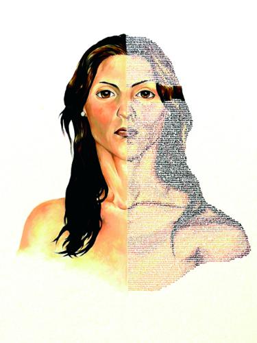 Beatriz Suarez Saá works very close to the visual poetry in her painting and sculpture. Both techniques materialize a cross section of the deepest identity of this young artist before the viewer. The self-awareness of her own image leaves the block or becomes words to form a visual image, a figure that shows and hides. A portrait that conveys her own female identity from many angles, roles, ages and feelings.
